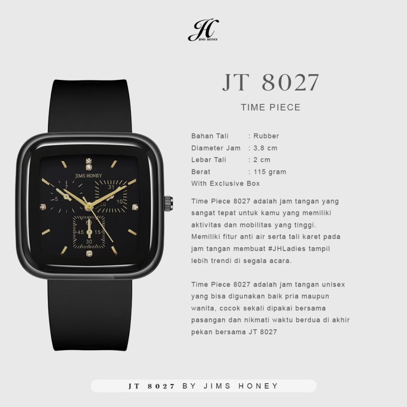 Time Piece 8027 adalah jam tangan unisex yang bisa digunakan baik pria maupun wanita, cocok sekali dipakai bersama pasangan dan nikmati waktu berdua di akhir pekan bersama JT 8027